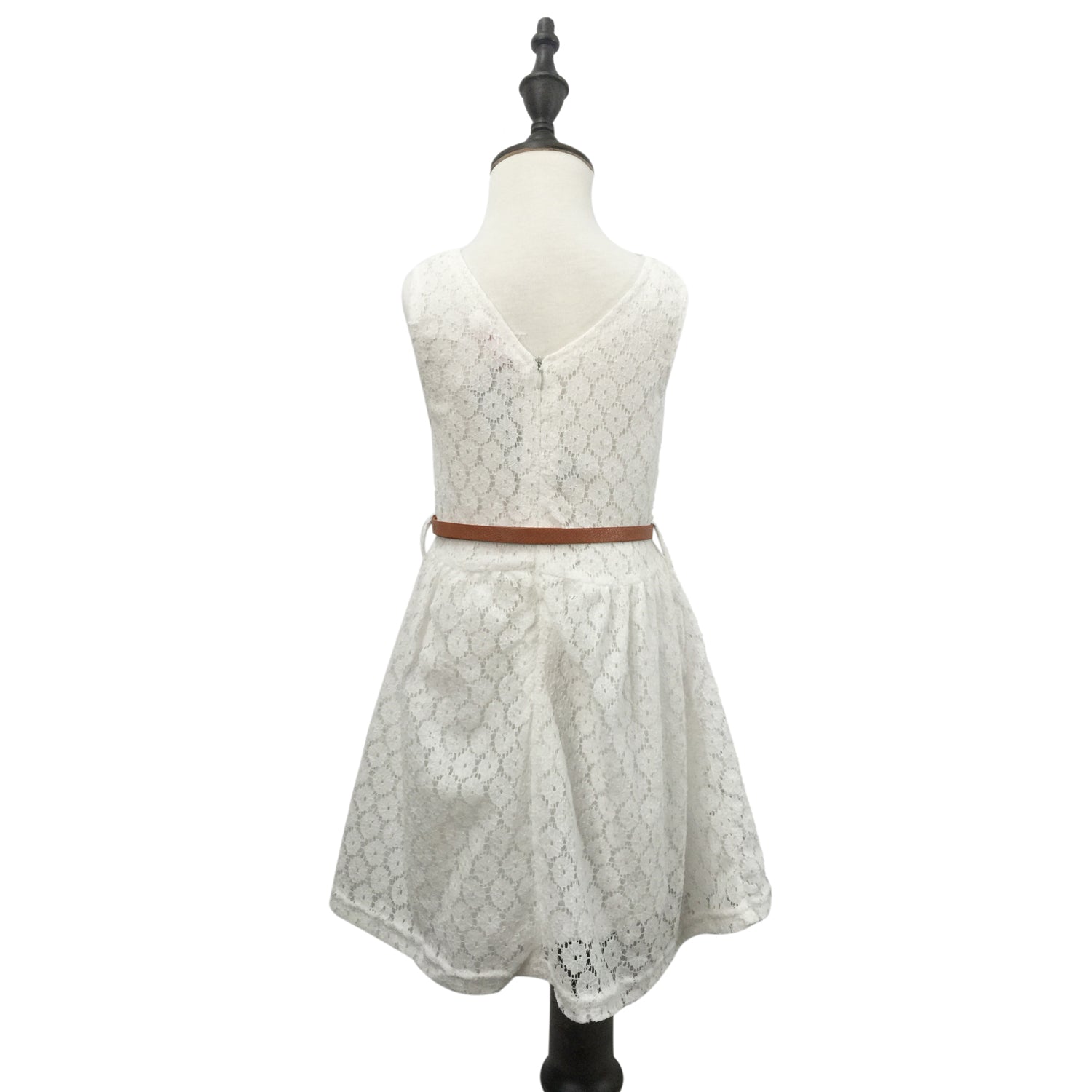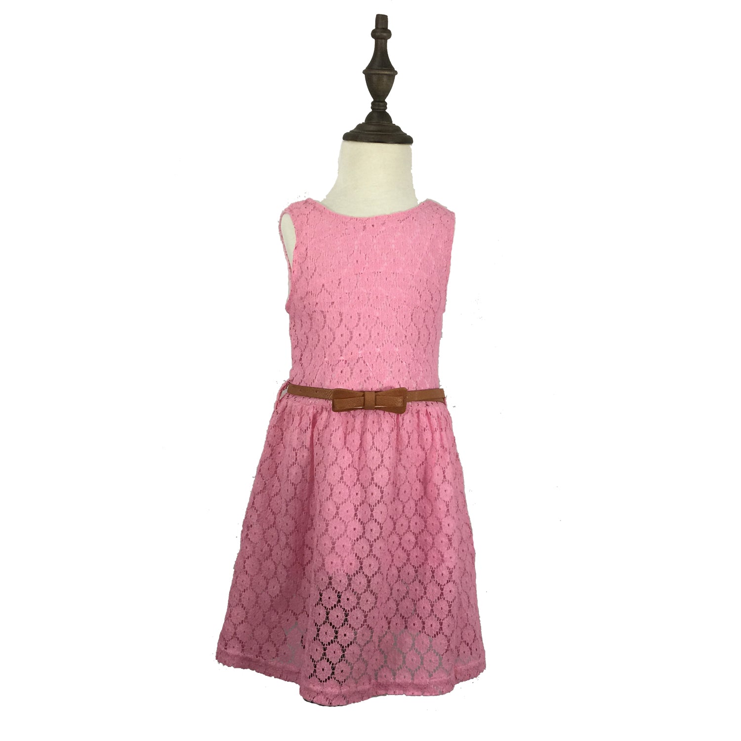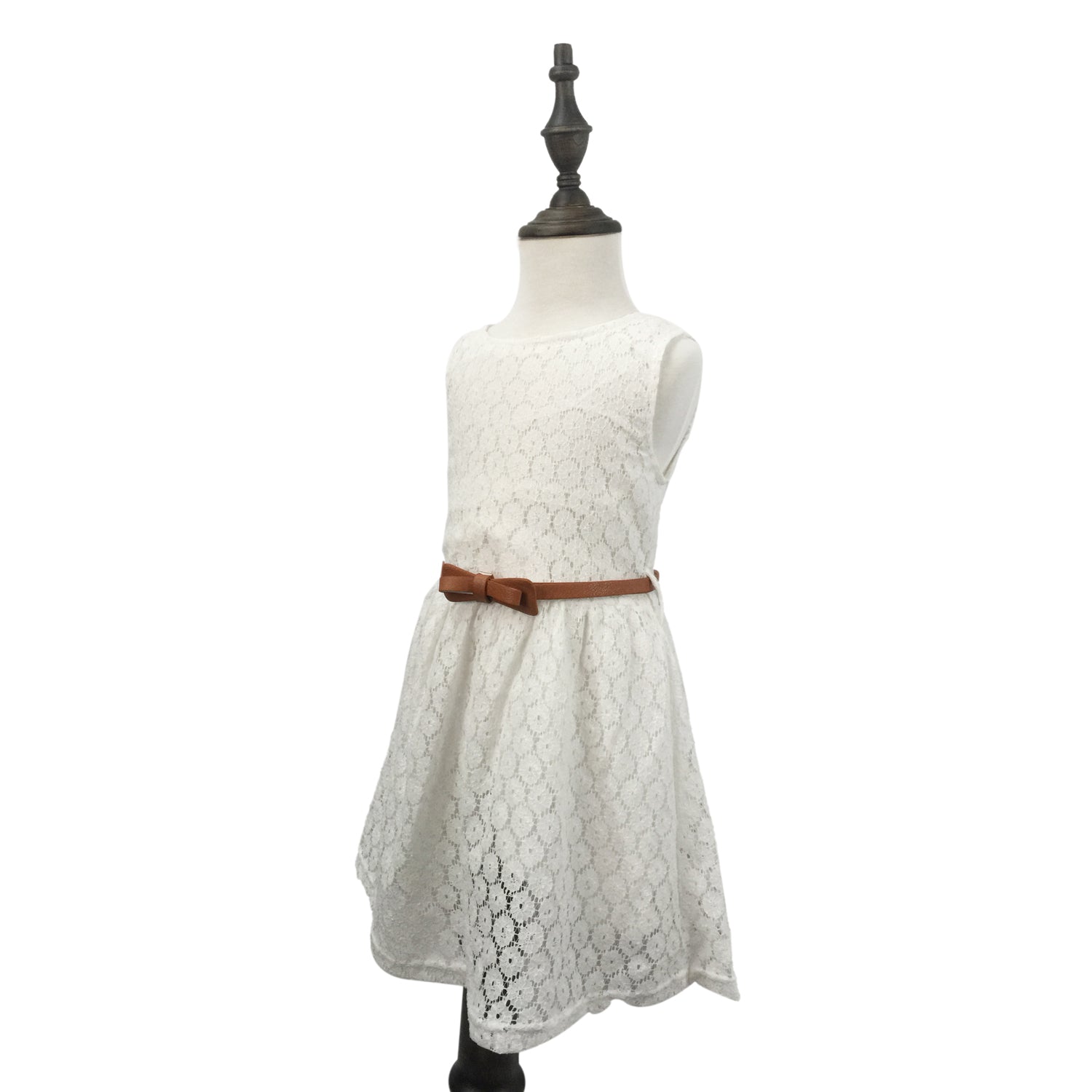 This elegant girls’ dress features an all-over floral lace design with a sleeveless cut and classic round neckline. The tea-length A-line skirt offers a graceful silhouette, while the waist belt with bow detail adds a charming finishing touch. Fully lined for comfort, it’s perfect for weddings, parties, and special occasions.
